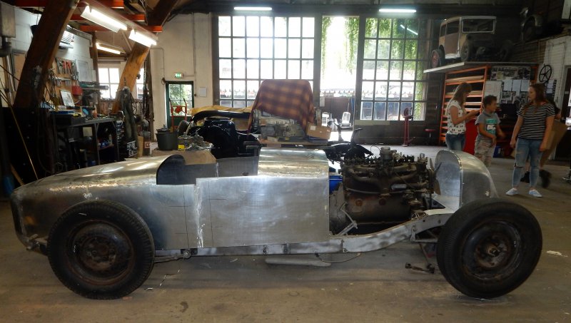 De mooie lange motorkap van de Rover 10 Special hebben we tot in detail doorgesproken. Gekozen voor "vaste" zijpanelen, waar aan de rechterzijde de 6 uitlaten naar buiten komen en daar verzamelen in een 63 mm uitlaat naar achteren. De uitlaat zal via een cherry bomb demper voor het achterwiel uitblazen.