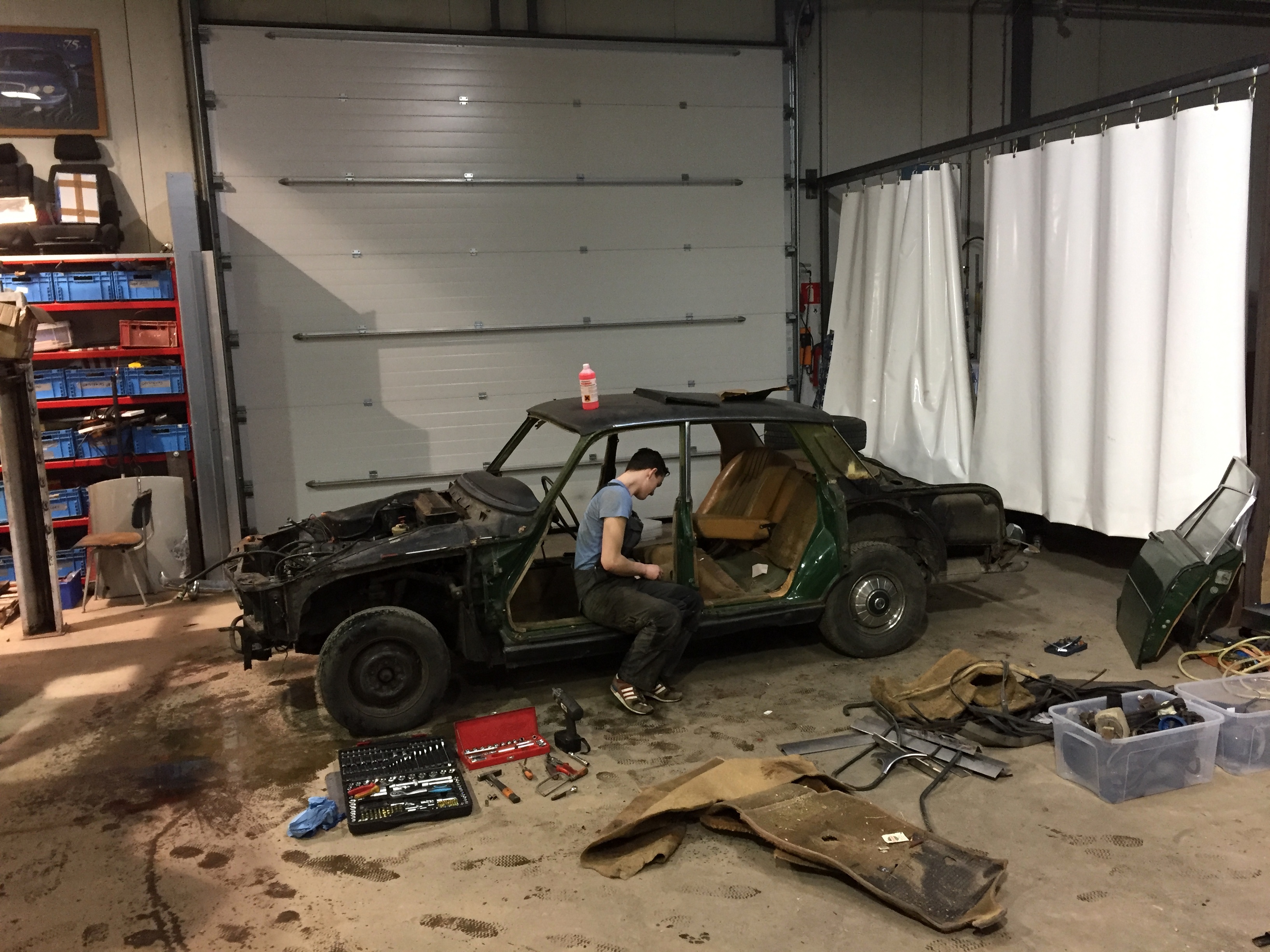 De auto is inmiddels van binnen “kaal”, op de bestuurdersstoel na. Deze laten we zo lang mogelijk staan om de auto in en uit de werkplaats te rijden. Saillant detail; de rolgordels zijn er later (opnieuw) ingezet en zaten vast met een parker van zo’n 4 mm. Je moet er niet aan denken dat je en noodstop moet maken en op deze gordelbevestiging moet kunnen rekenen………..