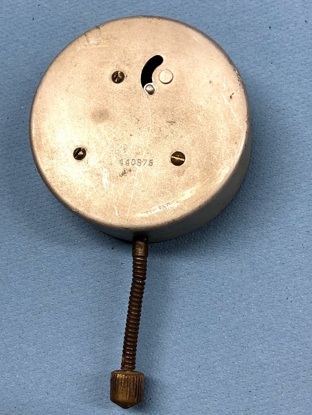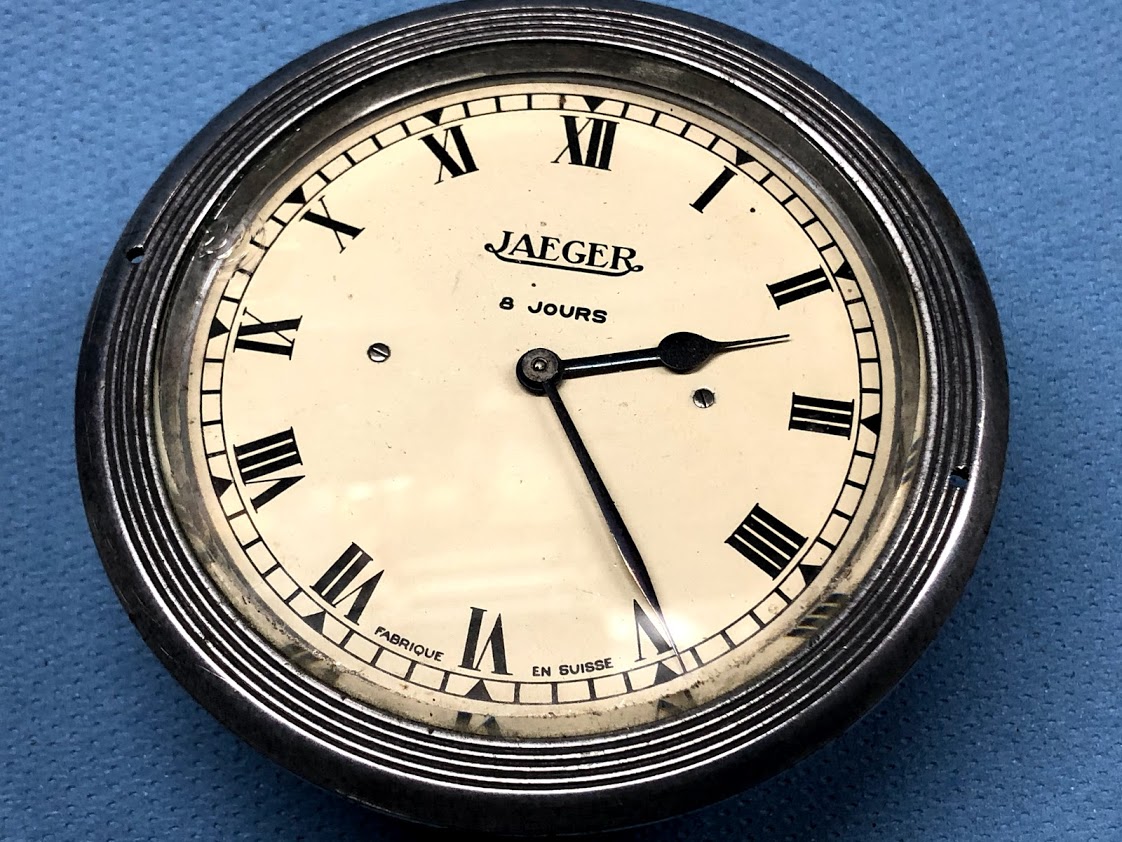 VINTAGE AUTOMOBILE CLOCK - JAEGER - MADE IN SWITZERLAND This used clock is in nice condition for it's age. It has some bezel and casing surface wear but will shine right up if polished. The round face measures a diameter of 95 mm. It has a clear face and glass. Just one little crack. It is nickel plating. It say on the front Jaeger 8 days Swiss. On the back it says made in Switzerland with a number 440876. The handle does move in and out and turns the needles.