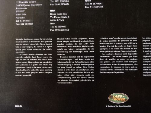 Dit originele en zeldzame boek van Range Rover bevat alle kleuren die je aan je auto kon geven. De kleuren glimmen nog dus het boek is nog in perfecte staat.
