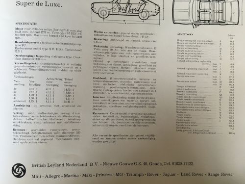 Een folder van 6 pagina's met Nederlandse tekst over de tweedeurs Marina. De folder bevat informatieve teksten en foto's over de auto. Ook bevat de folder specificaties van de auto.