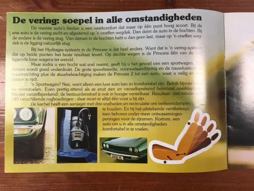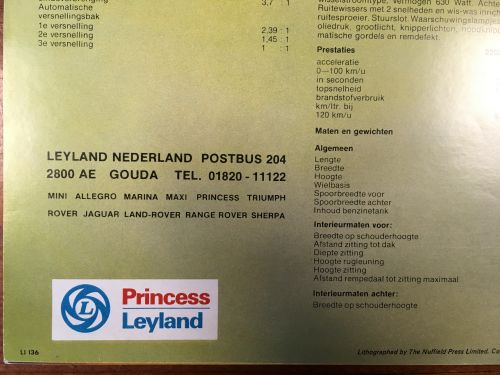 Een folder van 14 pagina's met Nederlandse informatie en foto's over de 3 auto's. Een folder van Princess Leyland met op de achterkant technische specificaties.