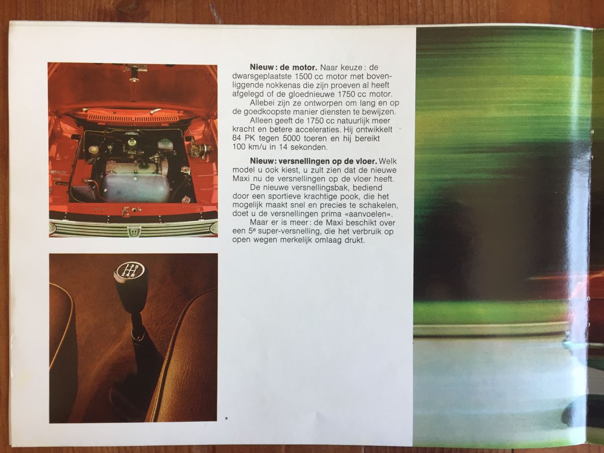 Een Nederlands talige folder met 10 pagina's aan informatie en foto's van de Austin MAxi 1750 & De Austin Maxi 1500